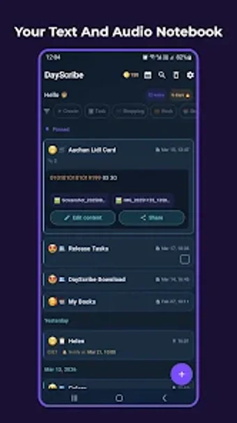 DayScribe is een veelzijdige notitie-app voor Android die het vastleggen van gedachten vereenvoudigt, zowel via tekst als audio. Gebruikers kunnen handsfree audio-opnamen maken die automatisch worden getranscribeerd, wat het gemakkelijk maakt om ideeën en reflecties onderweg vast te leggen. Daarnaast biedt de app een ingebouwde teksteditor voor het schrijven van uitgebreide notities, inclusief de mogelijkheid om takenlijsten te maken en notities te categoriseren op basis van stemming en onderwerp.
